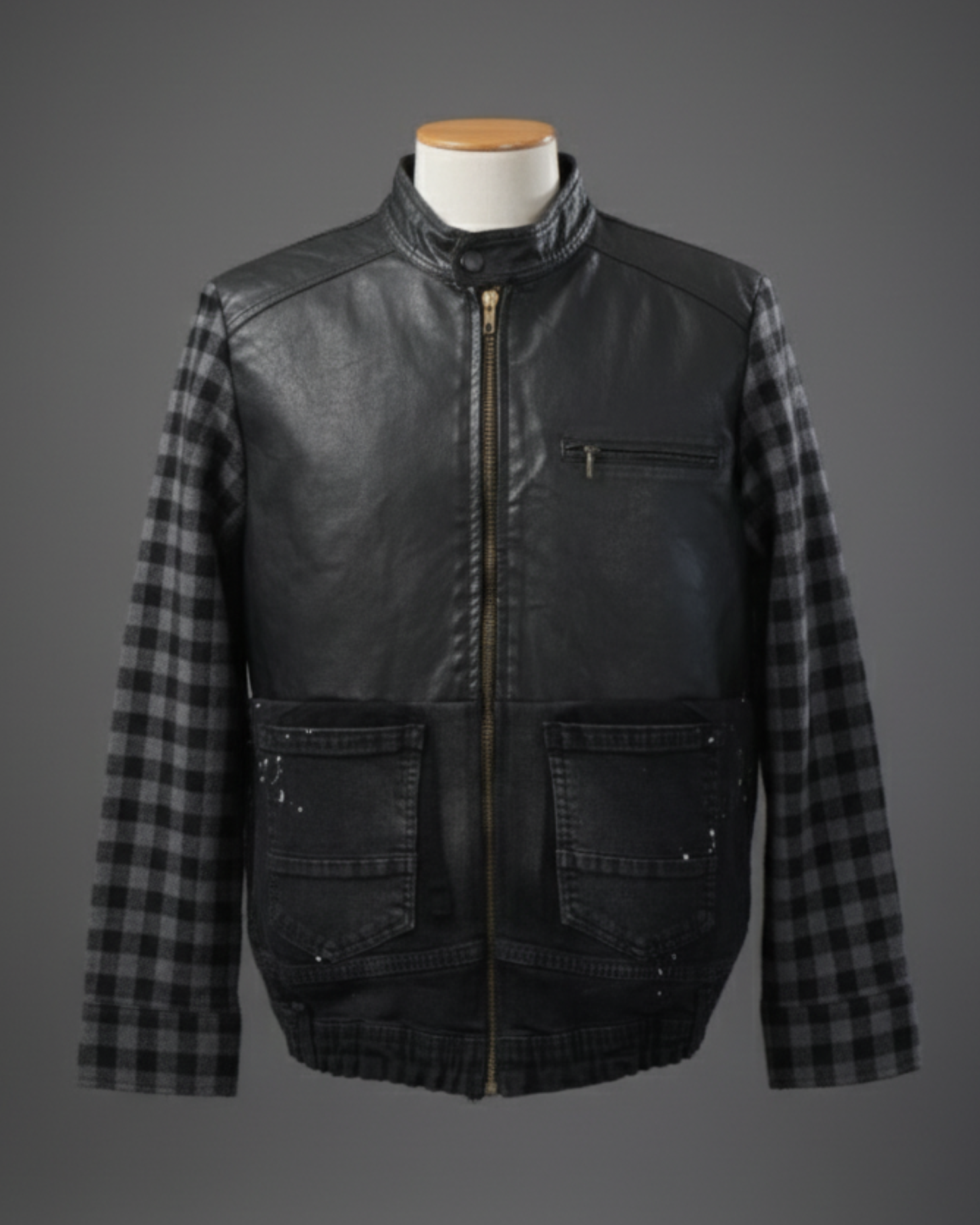 Fusion Layer Jacket” memadukan tiga karakter bahan dalam satu karya: kekuatan kulit, ketegasan denim, dan kehangatan flanel.